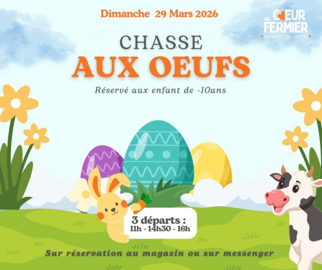 - Chasse aux œufs (5€/enfant) sur réservation au magasin, places limités. Créneaux horaires : 11h/14h30/16h